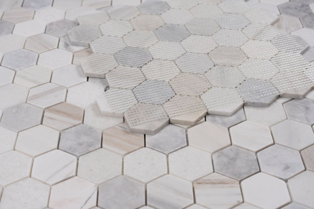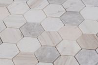 Hexagon Coastal 2 x 2: 4 different stone: Crystal white,, stormy grey, white eurasian, Milky white mixed together in 2x2 hexagon shape. Wooden White+Milky White+Light Grey Marble+Crystal White.
