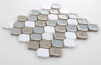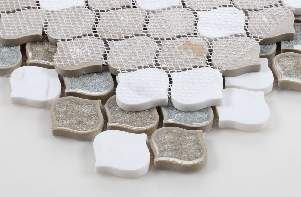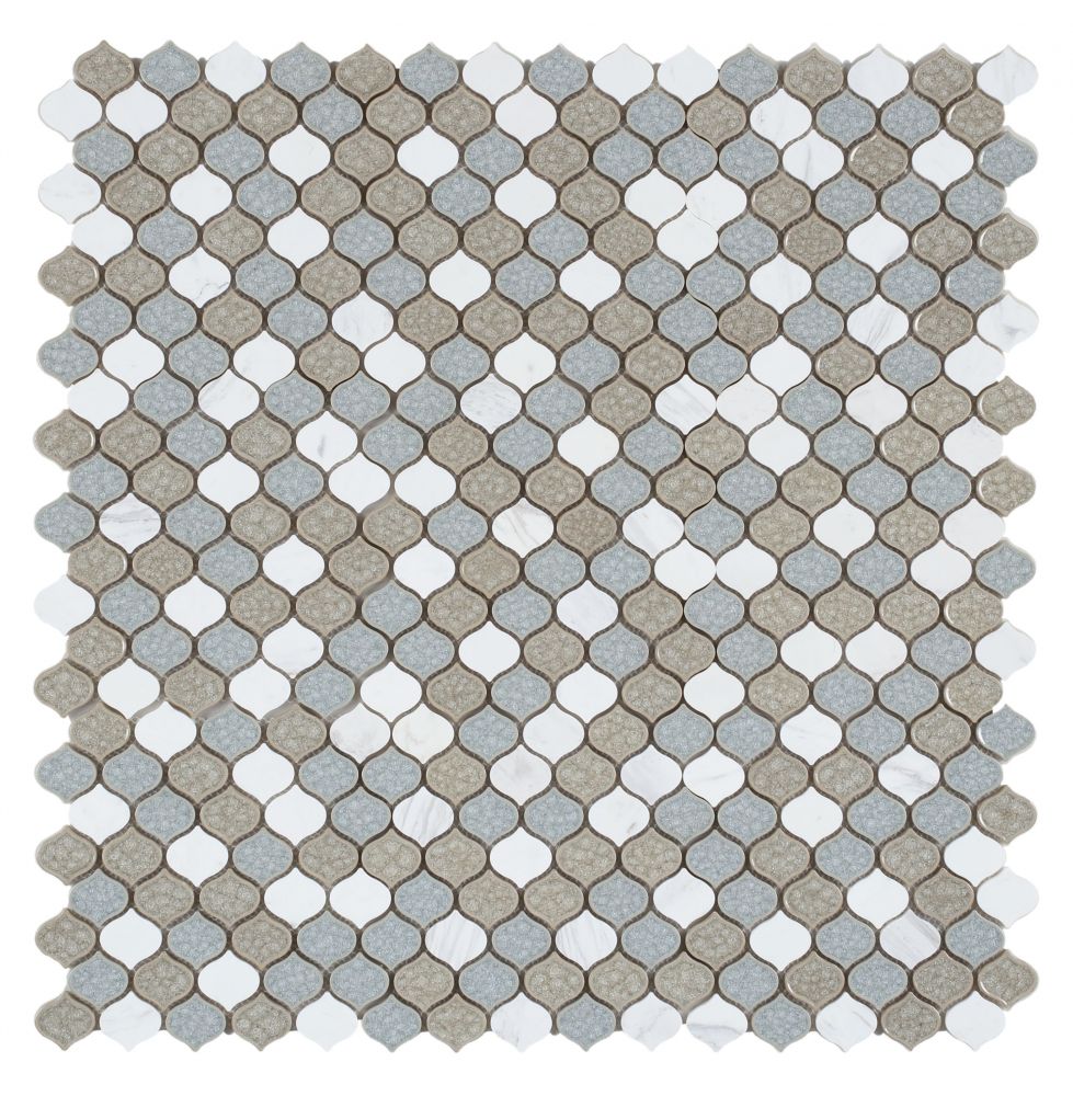 Van Gogh Sky - 2x2" arabesque shape Volakas white marble mixed with grey and blue crackle glass mosaic.